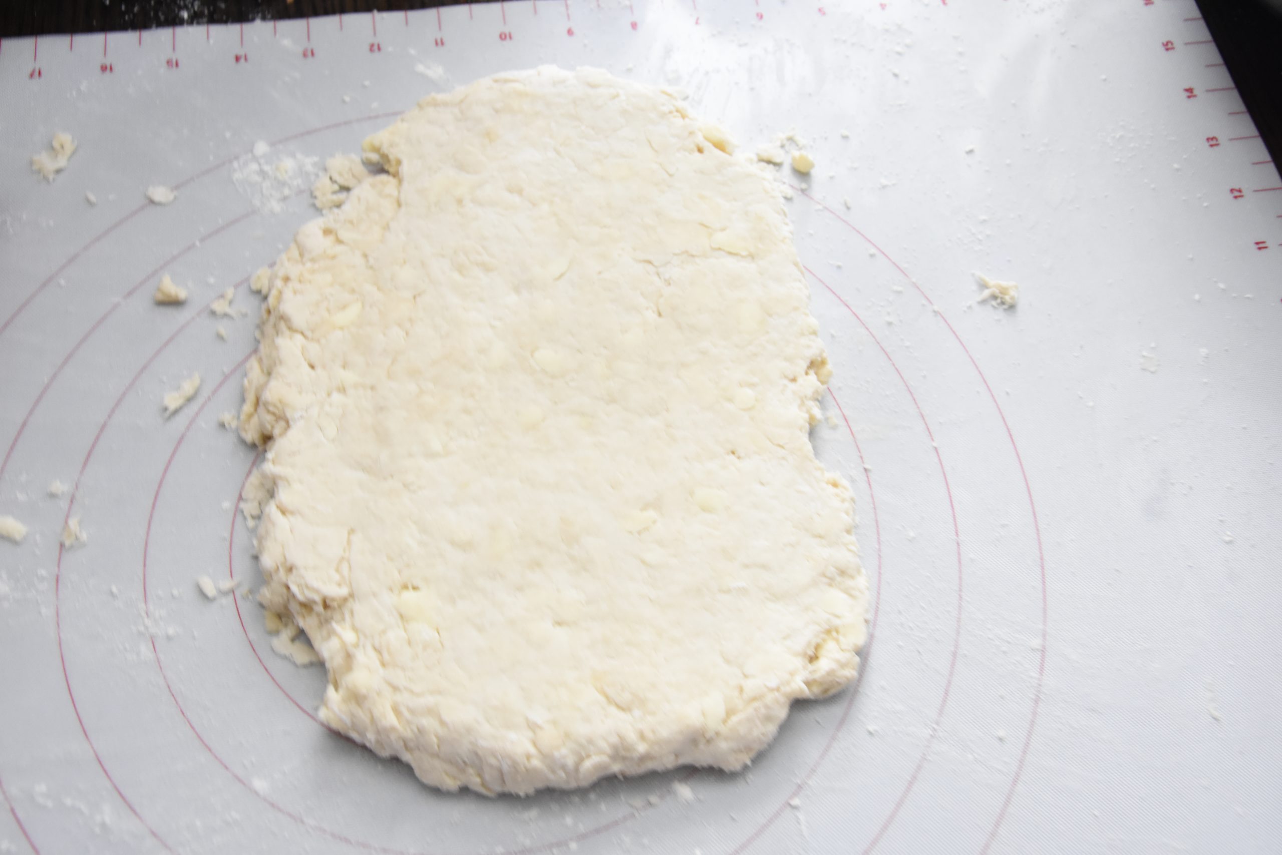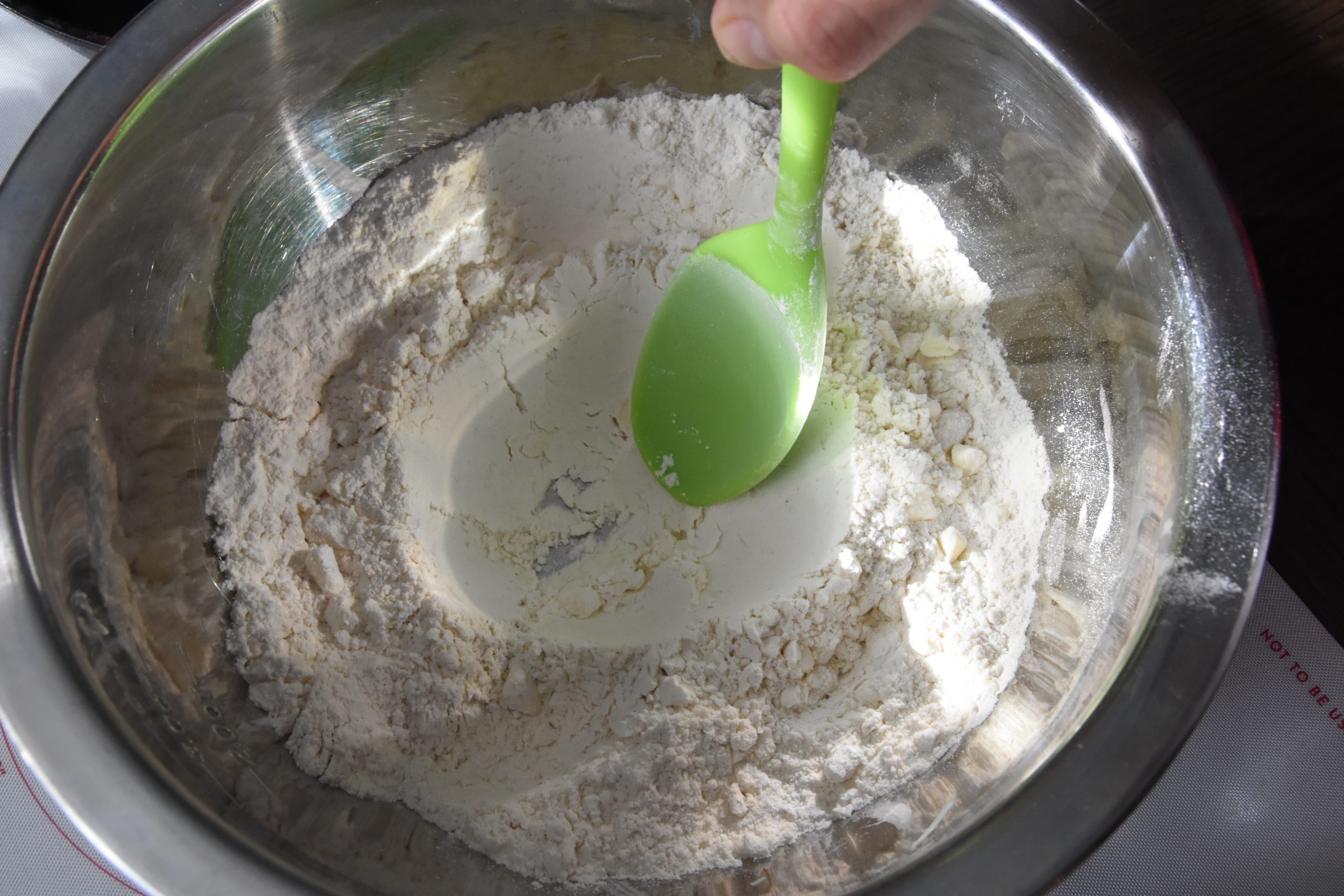 Hint: You can also use a food processor to cut the butter into the dough, which takes less time. Simply combine the flour, baking soda and salt into the food processor and pulse a few times. Then add the butter, cut into cubes, into the flour mixture and pulse again (about 7-10 times) until the mixture is crumbly. The dough should never come together while you're mixing it! It should only come together once you've begun kneading it and folding it.