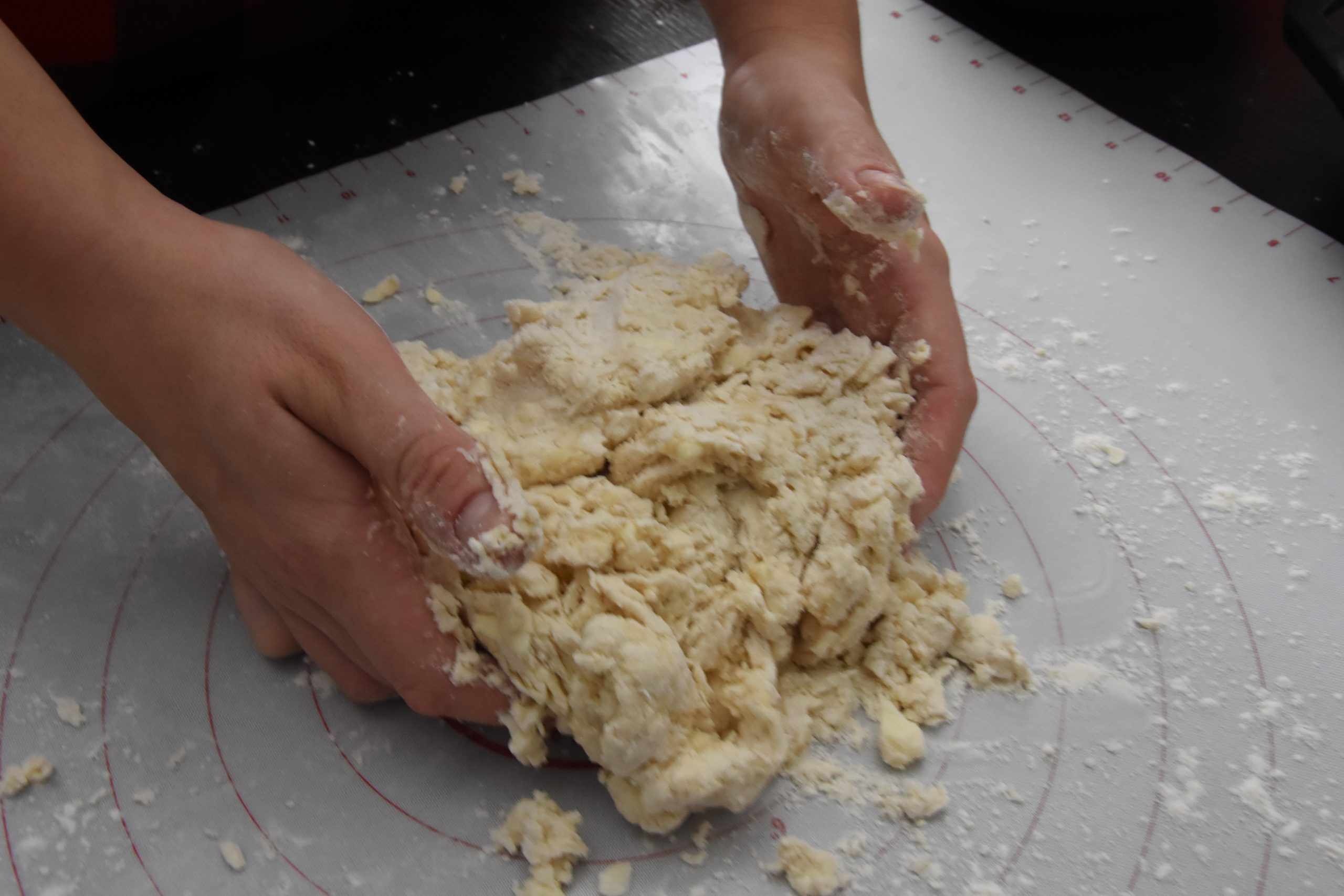 Turn the crumbly dough onto a floured surface, and begin to knead the dough together with your hands. You want to move quickly so that the butter doesn't melt.
