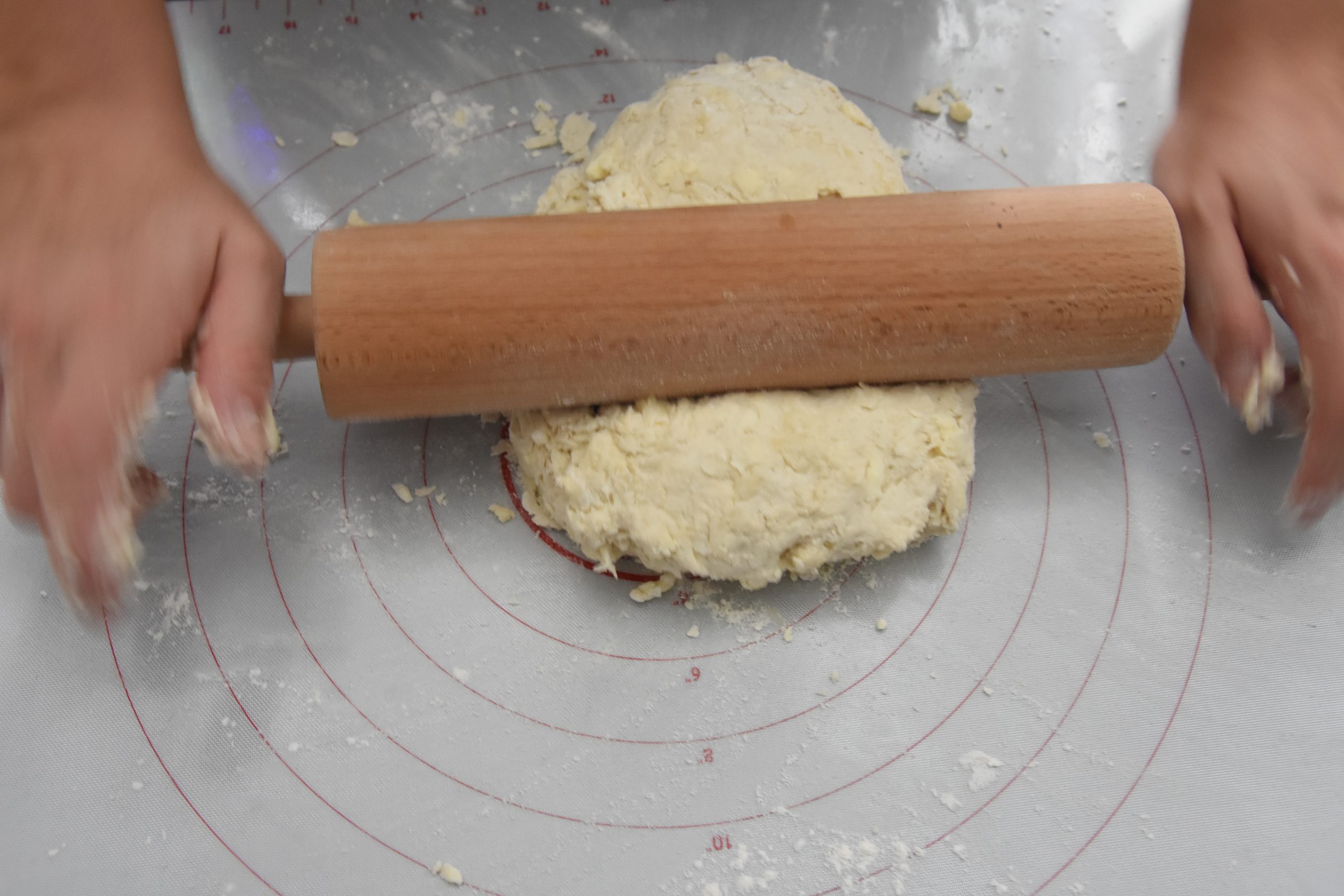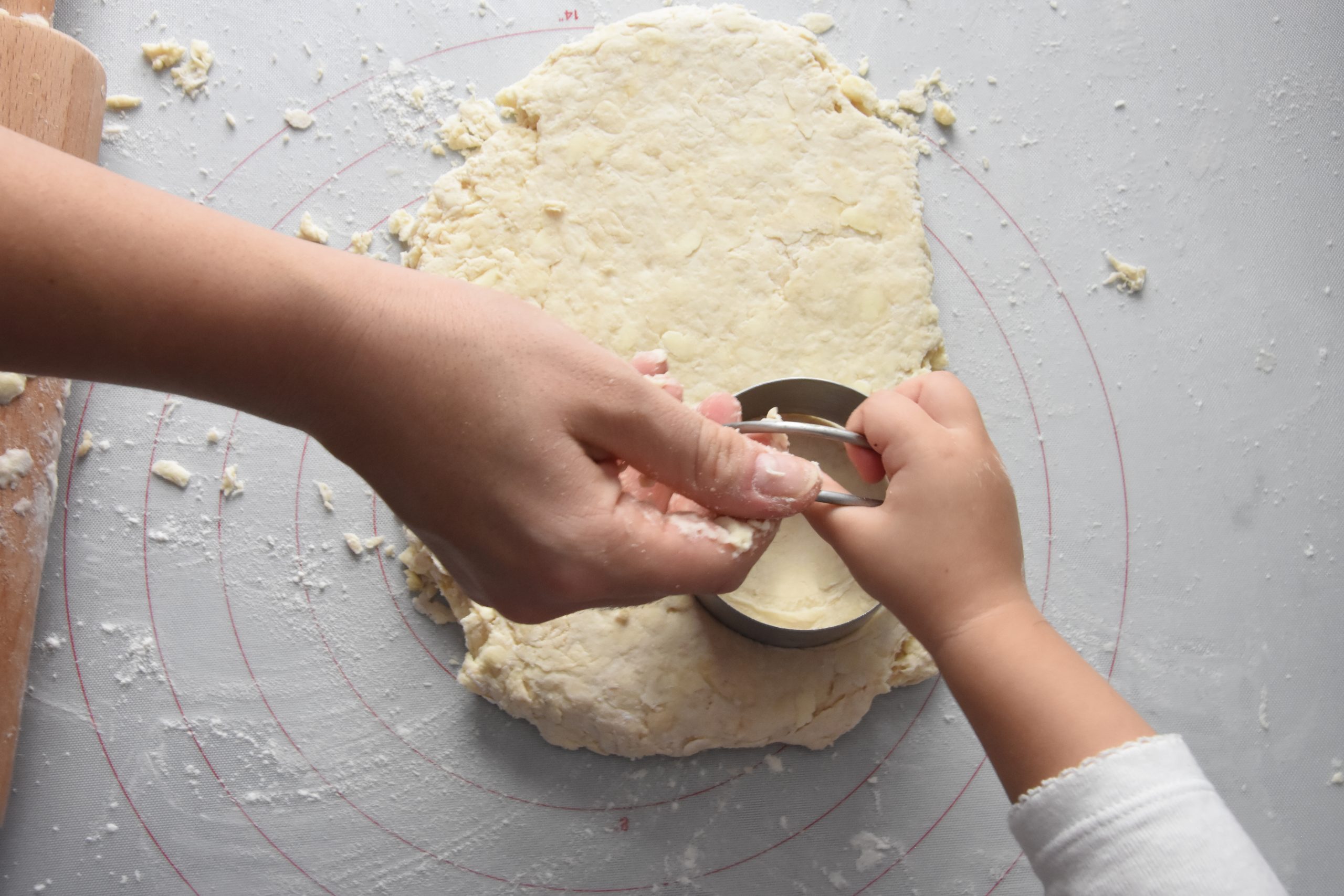 Once the dough is rolled out, dip a two-inch biscuit cutter into flour. Try not to overwork the dough.
