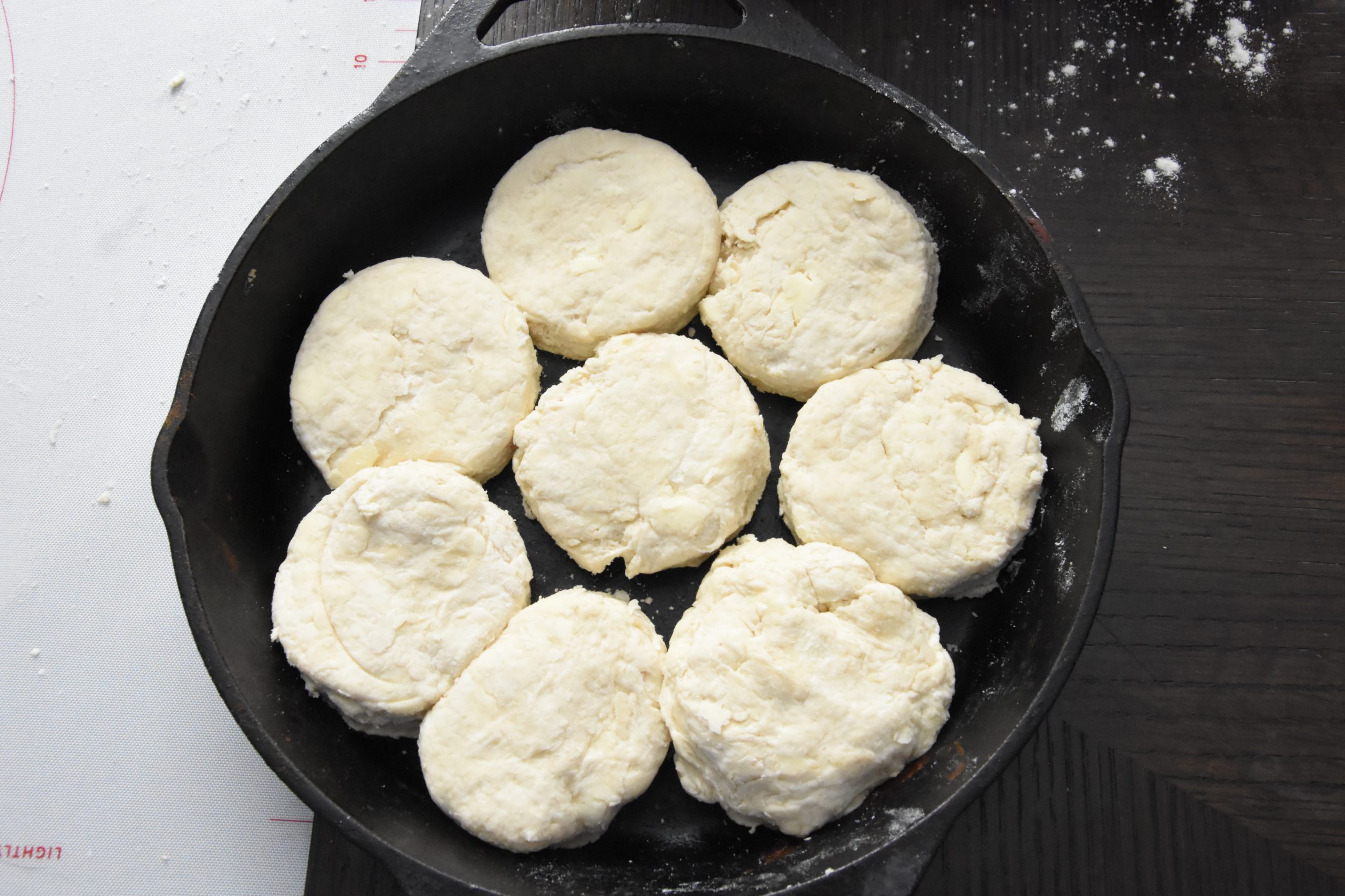 Once the biscuits are cut, place them into the 8-10 inch cast iron pan, sides touching. Brush the tops with buttermilk. Place in the pre-heated 425 degree oven, and bake for 18-20 minutes, checking at 15 minutes.